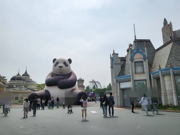 오랜만에 찾은 에버랜드는 푸바오 열풍에 힘입어 판다월드라고 불러도 될만큼 판다 캐릭터들이 많이 보였습니다. 판다 조형물의 끝판왕은 광장에 있는 대형판다 인형입니다. 옆에 있는 건물만큼 큰 크기의 판다인형 앞에서 많은 분들이 사진을 찍는 모습을 볼 수 있습니다.