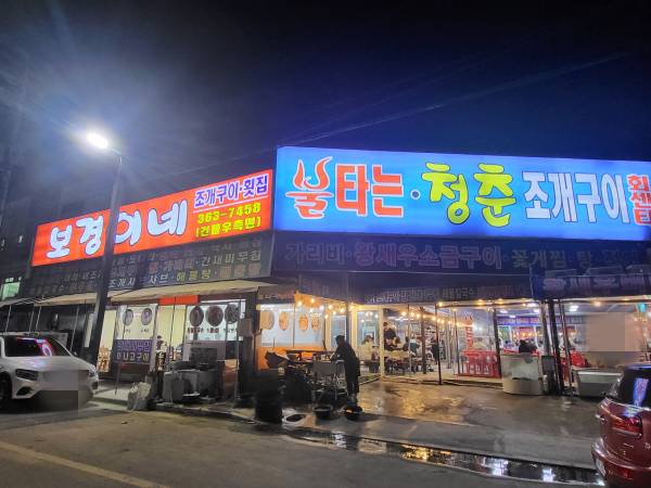조재구이 맛집으로 유명한 '보경이네 불타는 청춘 조개구이'는 바다공원 놀이동산 정문쪽에 위치하고 있습니다. 규모도 크고 사람들로 북적이는 곳이기 때문에 쉽게 찾을 수 있습니다. 간판은 보경이네와 불타는 청춘 조개구이 2개가 걸려 있지만 결국은 한 개의 가게인 것 같습니다.