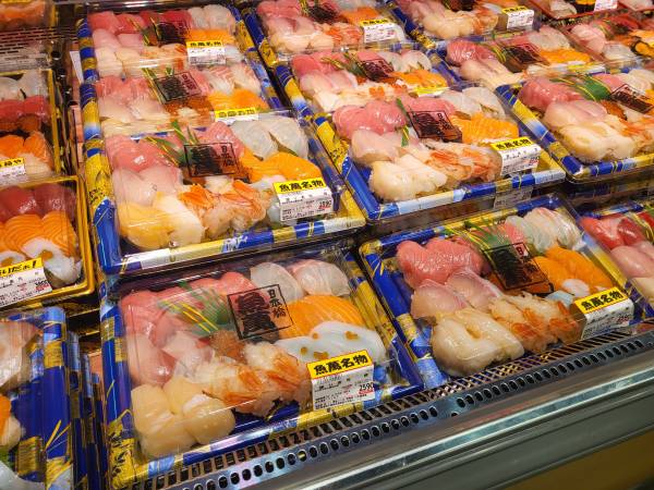 수산물 코너 쪽에는 각종 초밥종류들도 다양하게 판매되고 있습니다. 초밥에 얹혀 있는 회의 크기와 밥의 양이 상당한데 비해 가격이 저렴한 편이라 가성비 좋은 도시락입니다. 초밥뿐만 아니라 숙성회나 각종 해산물이 올라가 있는 카이센동도 여러 종류 판매 중이었습니다.